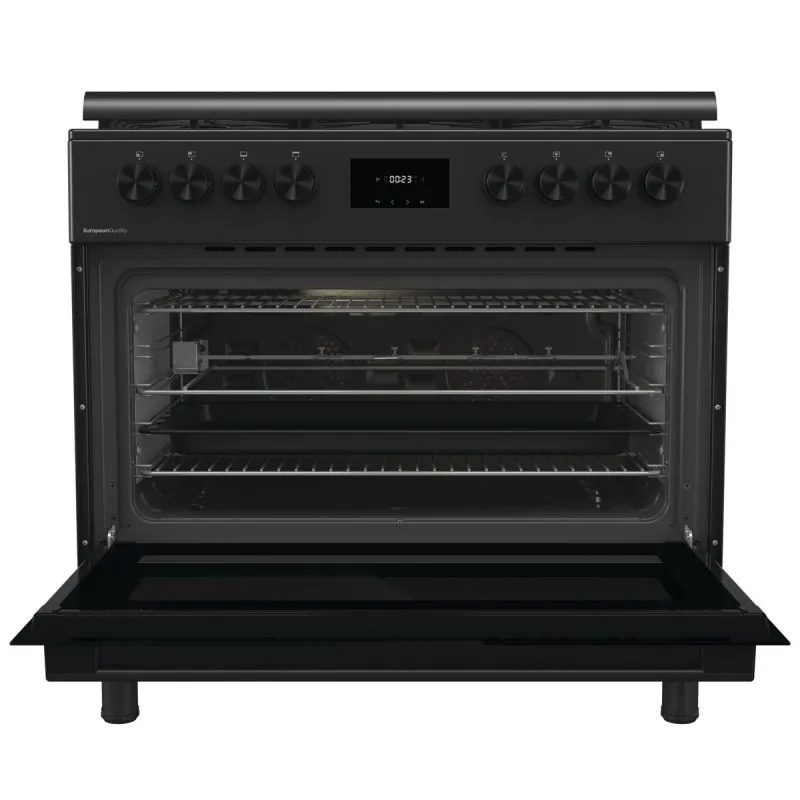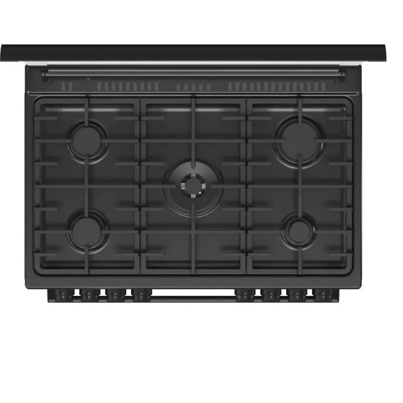 بوتاجاز غاز قائم بذاته اسود مقاس 90 سم، 5 شعلات غاز، سعة 110 لتر، فرن متعدد الوظائف مع مروحتين و جوانب و ضهر كاتليتك، دعامة مقلاة من الحديد الزهر، قلي هوائي، إغلاق هادئ وسلس لباب الفرن