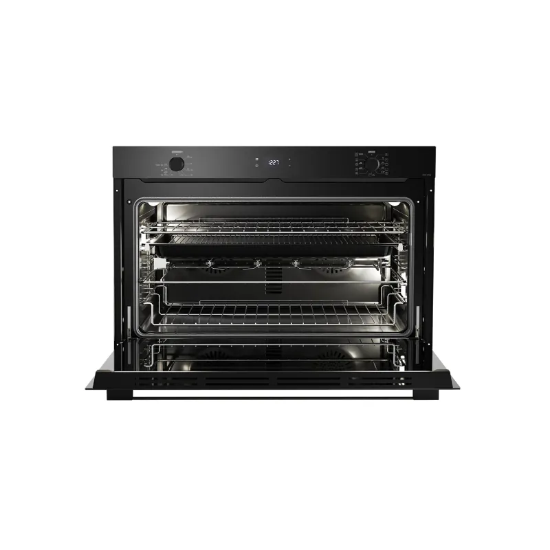 .فرن كهربائي متعدد الوظائف أسود، 90 سم، سعة 121 لترًا صافيًا، 5 مستويات قابلة للاستخدام، تسخين مسبق سريع، شواية دوارة، باب يغلق بسلاسة، تحكم باللمس